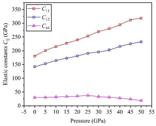 At the same time, Figure 4 demonstrates the variation curves of elastic constants in Ti0.5Ta0.5 alloy under the applied pressure ranging 0 to 50 GPa. Results display that and have the same trend that the values of theoretical predictions increase monotonously with the increase of applied pressure, and the elastic constant increases slowly and then decreases gradually, where the increase of elastic constants indicates that the deformation resistance of Ti0.5Ta0.5 alloy becomes stronger. Meanwhile, the calculated values of always satisfy the stability criterion of crystal structure in the range of applied pressure, suggesting that the high-pressure mechanical stability of Ti0.5Ta0.5 alloy cannot be destroyed.