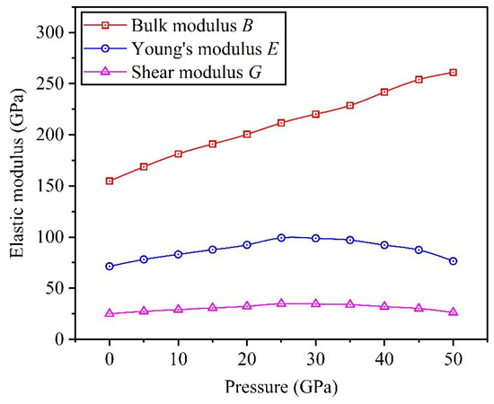 Through calculation, the theoretical predictions of elastic moduli are obtained, and Figure 5 depicts the corresponding variation curves for the Ti0.5Ta0.5 alloy under the applied pressure in the range of 0 to 50 GPa. Obviously, bulk modulus B increases gradually as applied pressure increases, which indicates that high pressure for Ti0.5Ta0.5 alloy can enhance its resistance to volume change. E and G first increase and then decrease gradually, and both of them get the maximum values at P = 25 GPa, which indicates that increasing pressure can improve the resistances to elastic and shear deformations between 0 and 25 GPa, but decline their resistances beyond 25 GPa. Furthermore, we compare the theoretical predictions of elastic moduli with available theoretical and experimental data for Ti0.5Ta0.5 alloy under and , and Table 3 shows that the calculated data of this work are well consistent with the research results of others [7,12,25].