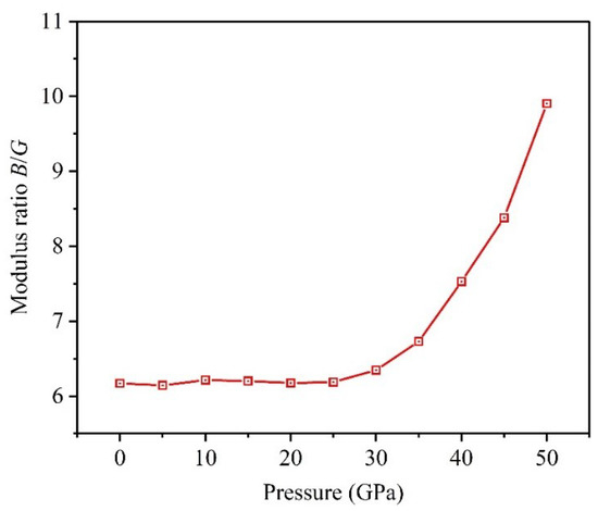 Researches show that putting pressure on materials will affect the ductile-brittle transition of crystal structure, thereby influencing the mechanical properties of materials [29,30]. Pugh proposed a significant conclusion that the brittleness or ductility of materials depends on the modulus ratio [27], and denotes the ductility, and indicates the brittleness. In light of the calculated elastic moduli, Figure 6 depicts the changing curve of the modulus ratio under pressure changing from 0 to 50 GPa. The result shows at any pressure, suggesting that the Ti0.5Ta0.5 alloy has good ductility. Additionally, there is a critical pressure P = 25 GPa; namely, the ductility of Ti0.5Ta0.5 alloy is almost invariable at the pressure between 0 and 25 GPa, whereas the ductility of the alloy significantly increases when the applied pressure further increases.