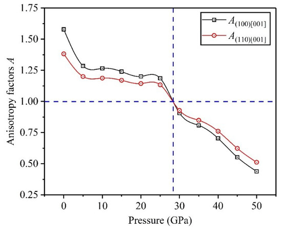 In crystalline materials, the elastic anisotropy of crystal structure influences the mechanical properties of materials. At present, researchers usually use the anisotropy factor A to investigate this physical characterize, and materials with are isotropic, otherwise anisotropic [31,32]. In 1986, the impacts of elastic anisotropy on mechanical properties of materials had been thoroughly studied by Yoo [33], he found an interesting phenomenon that a large A can enhance the tangential force to drive the cross slip of screw dislocations, and then proposed a significant model, namely, the cross-slip and pinning model. Herein, and denote the elastic anisotropy in the (100)[001] and (110)[001] directions, and the calculation formulas are and , in which [34,35]. Through calculation, Figure 7 plots the variation curves of anisotropy factors of Ti0.5Ta0.5 alloy under applied pressure. The values of two anisotropy factors are equal to 1 when the applied pressure is about 28 GPa, indicating that the Ti0.5Ta0.5 alloy is an isotropic material at 28 GPa. In the light of the trend of variation curves, the elastic anisotropy of Ti0.5Ta0.5 alloy decreases with increasing pressure between 0 and 28 GPa, but increases under applied pressure ranging from 28 to 50 GPa, thereby the tangential force decreases first and then increases in promoting the cross slip of screw dislocations.