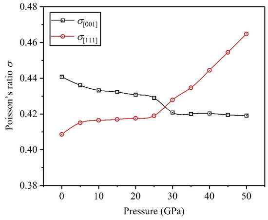 Poisson’s ratio is a significant physical parameter that can be used to determine the plasticity of materials; thus, we investigate the change of Poisson’s ratio of Ti0.5Ta0.5 alloy under the applied pressure in this paper. For Poisson’s ratio , the value changes from −1 to 0.5, and a large value indicates good plasticity. Reed et al. [36] put forward an important conclusion that and were the smallest and largest bounds for central-force solids, respectively. Additionally, Fu et al. [35] found that the magnitude of was used for defining the sort of interatomic bonding. In this paper, Poisson’s ratios and in the [001] and [111] crystallographic directions are calculated according to the theoretical predictions of elastic constants , and the calculation formulas are and [37]. Figure 8 plots the changing curves of Poisson’s ratios with respect to applied pressure in Ti0.5Ta0.5 alloy. The values of and reveal that the central forces in the [001] and [111] crystallographic directions make a greater contribution to the interatomic bonding for the Ti0.5Ta0.5 alloy in essence. Clearly, Poisson’s ratio monotonously decreases with the increase of applied pressure, while Poisson’s ratio is reversed and gradually approaches the value of upper bound 0.5, which shows that the high pressure can strengthen the interatomic bonding, thereby improving the plasticity of Ti0.5Ta0.5 alloy in the [111] crystallographic direction.