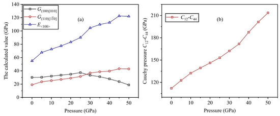 Furthermore, we calculate the other moduli of Ti0.5Ta0.5 alloy, including , , and , to further study the related mechanical performances, where represents the shear modulus in the direction, and indicates the one in the direction, respectively, and denotes Young’s modulus along the direction. These parameters can also be obtained by elastic constants , and the calculation formulas are , , and [32,38], and Figure 9a draws the variation curves of material moduli under applied pressure ranging from 0 to 50 GPa. It shows that the total varying trends of and increase gradually as the applied pressure increases, although decreases slightly at 50 GPa, indicating that high pressure strengthens the resistances to shear and elastic deformations of Ti0.5Ta0.5 alloy in the and crystallographic directions. Different from and , shear modulus initially increases and then decreases when applied pressure increases, and reaches the maximum value at 25 GPa, which shows that the Ti0.5Ta0.5 alloy has the strongest shear resistance along the direction under P = 25 GPa, while the shear deformation resistance of the alloy will decline if the pressure continues to increase.
