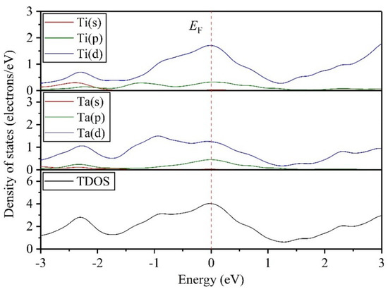 The valence electrons determine the bonding form between atoms, thereby influencing the microstructure and macroscopic physical properties of the crystal. Therefore, the electronic structures are given and discussed to study the structural stability of Ti0.5Ta0.5 alloy under applied pressure in this paper. Figure 10 exhibits the changing curves of the partial density of states (PDOS) and the total density of states (TDOS) at P = 0 GPa, where the red dash line stands for the Fermi level (). For the TDOS curve, it can be found that the value is not zero at , suggesting that the Ti0.5Ta0.5 alloy exhibits the metallicity, which verifies the conclusion in Figure 9b. For PDOS curves, they show that the Ti-3d and Ta-5d states have the greatest effect on DOS at 0 eV, while the effects of the Ti-4s and Ta-6s states on DOS are almost negligible.