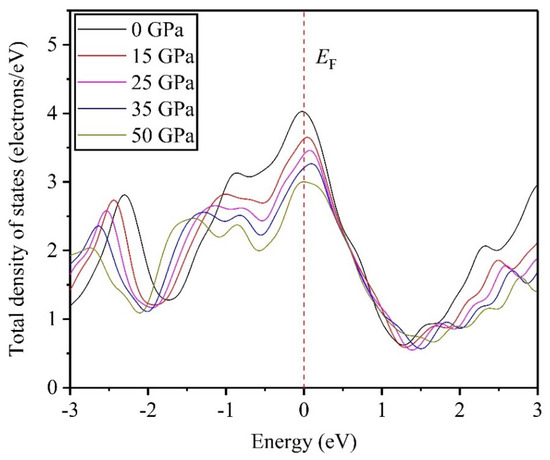 Meanwhile, Figure 11 describes the changing curves of TDOS versus pressures of 0, 15, 25, 35, and 50 GPa. From these changing curves, the results show that energy of the valence-band maximum increases as applied pressure increases, while the one of the conduction-band bottoms was reversed, indicating that high pressure decreases the band gap between the conduction band and valence band, and the outer electrons tend to easily transfer from the valence-band maximum to the conduction-band bottom. Hence, high pressure may destroy the structural stability of Ti0.5Ta0.5 alloy, which affects the microstructure and macroscopic physical properties of Ti0.5Ta0.5 alloy. At the same time, according to the results of Figure 4, it can be found that the value of elastic constant may become negative as the applied pressure increases further, which indicates that the Ti0.5Ta0.5 alloy may produce the structural phase transition under higher pressure, and the analysis result is consistent with the previous conclusion in Figure 11.