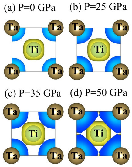 Finally, the charge density diagrams of isosurface contours versus various pressures are presented to understand the local chemical bonding in the Ti0.5Ta0.5 alloy, as shown in Figure 12, where the isosurface levels are set to 0.0425 ( is the Bohr radius). With increasing applied pressure, the local chemical bonding between Ti and Ta atoms gradually increases, implying that the high pressure can enhance the electron interaction between the two atoms, thereby increasing the local chemical bonding between them, and the change increases as applied pressure increases. However, the strong interactions between two atoms may destroy the stability of the crystal structure. Therefore, the structural phase transition may occur in the Ti0.5Ta0.5 alloy under higher pressure beyond 50 GPa, which coincides with the result in Figure 11.