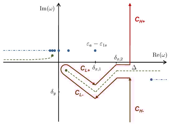 The cut structure of the Dirac-Coulomb Green function is defined by that of the square root . The square root function is defined to be positive in the gap on the real E-axis. Outside of the gap, the sign of the square root is fixed by the condition . Special care should be taken evaluating the Green function for real energies . Behaviour of the Green function on the real E axis is defined by the sign of the infinitesimal addition in the energy denominator of Equations (5) and (8). In our case the addition is negative and, therefore, the cut should be approached from the upper half of the E plane, and the cut from the lower half. So, e.g., starting from the gap and approaching the branch cut from the upper half-plane, we have the following prescription [] for the analytical continuation of the square root: .