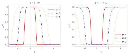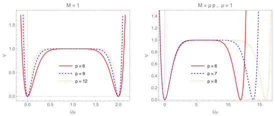 Both panels show the potential of the (22) model for different values of p for and (left and right panels respectively), where M and are p-independent constants. Inflation takes place around the local maximum of the potential. Right panel: Note how the local maximum is moving towards bigger for bigger p.