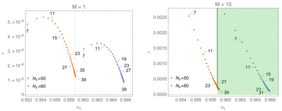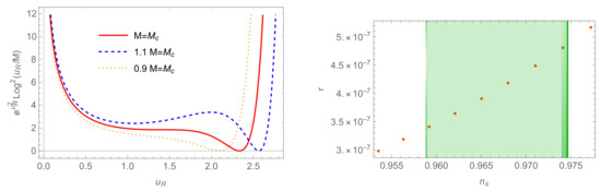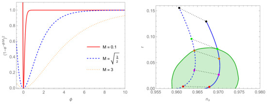 while in the limit the model becomes equivalent to the inflation, which gives and . The inflationary potential for different values of M together with the consistency of the model with the data have been presented in Figure 3. In particular, for or one recovers Starobinsky inflation or its Brans–Dicke generalization, respectively. in the Brans–Dicke theory is a parameter defined by the properties of kinetic term of the scalaron and not by mass of fields, just like in [30].