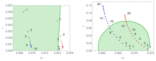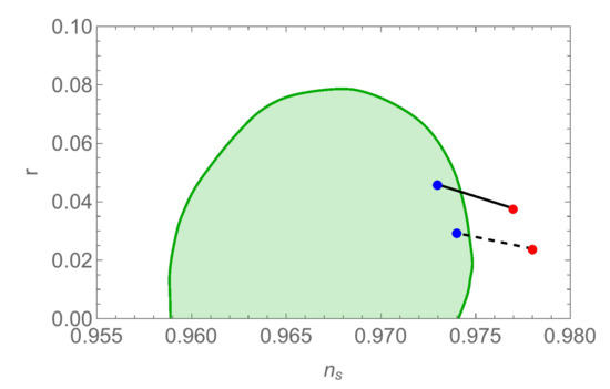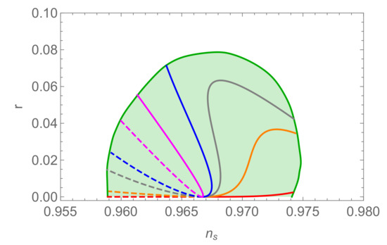 r and should be taken at a moment, when the pivot scale leaves the horizon. This moment corresponds to e-folds before the end of inflation, where is usually taken to be around 50 or 60. In all the figures, the green region corresponds to values of observables allowed by current observations.