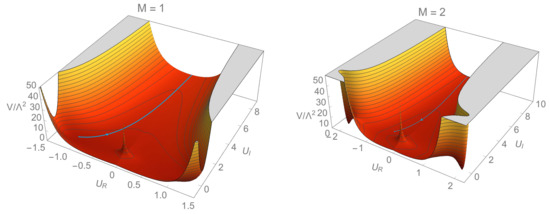 The shape of the potential for and is presented in the Figure 10. This model could also be expressed using a string-inspired superpotential together with . Within the slow-roll approximation one finds