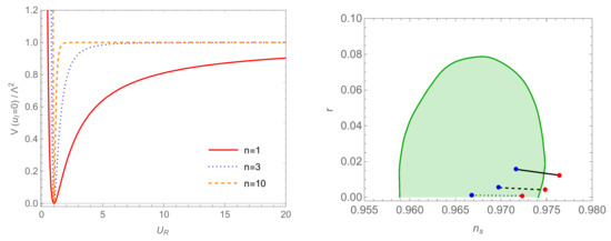 In such a case one finds the global minimum of the potential at and . The scalar potential (38) is presented in Figure 7. The model can be easily generalized into , which gives . Increasing n decreases r and moves inside the of the Planck/BICEP data. The results for , and are presented in the Figure 7. Please note that the same model could be obtained using different and . For instance, for and string-inspired superpotential one obtains exactly the same form of .