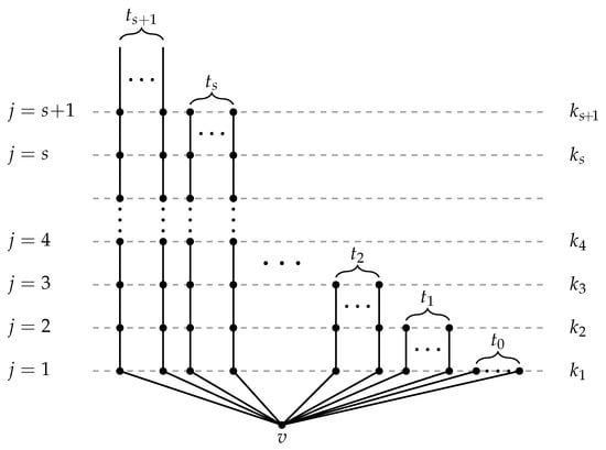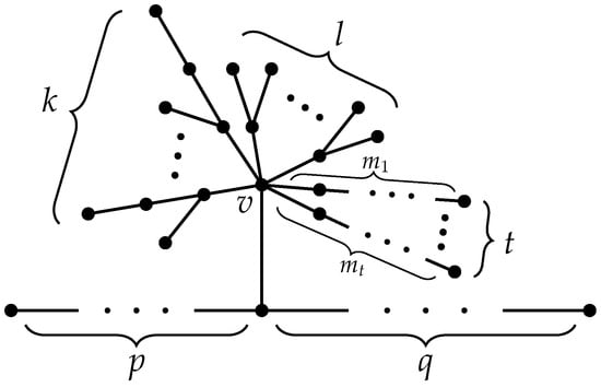 Furthermore, from the discussion on the values of p and q in [], it basically follows that the right-hand side of Inequality (2) can be taken to have discrete values, such as . Thus, for one of these (fixed) discrete values of the right-hand side of Inequality (2), without losing too much generality, we can regard L-reflexive trees as trees having the canonical structure given in Figure 2.