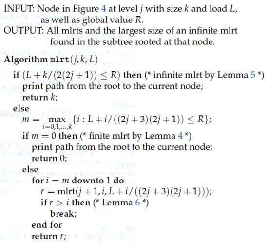 The basic idea of the algorithm for discovering a maximal L-reflexive tree (mlrt) having the structure given in Figure 2 is to use Lemma 1 to incrementally compute its corresponding sum L until it exceeds value R. Assuming for the moment that a maximal L-reflexive tree is finite, starting from nodes, , at level 1, and going up level by level, at next level j we add nodes (and edges) so that their total contribution, i.e., , to already computed sum L does not exceed R. Clearly, if adding even one node at some level j makes already computed sum L greater than value R, then the tree encoded by sequence is maximally L-reflexive.