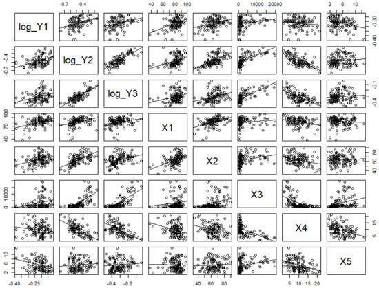 The dependency between response and predictor variables can be shown visually by the matrix plot, as exhibited in Figure 1. The correlation between X3 and X4 (−0.585) is stronger than the correlation between X4 and the other predictor variables, even stronger than other pairs. The correlation between X1 and X5 (−0.017) is weakest compared to the correlation of other couples. There are indications that the relationship is non-linear between X3 with the response variable and the other predictor variables. For the correlation between response and predictor variables, log(Y1) has the strongest correlation with X1 (0.434) compared to other predictors. The log(Y2) and X3 have the strongest correlation (0.705) compared with other predictors, while the correlation of log(Y3) and X3 is the strongest one (0.744). This value shows that log expenditure index and population density has the strongest relationship among other pairs.