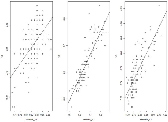 The predictions resulting from the MGR model are expected to be close to the actual values. The closer those two values, the narrower the spread, as displayed in Figure 2. It can be seen that fitting values for Y2 and Y3 are better than those of Y1. This result is also supported by significant predictors, as reported in Table 4. The life expectancy index has one significant predictor, while the other two responses have two significant predictors that increase their coefficients of determination.