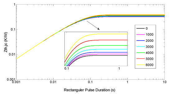 During the power cycle test, it is necessary to measure the junction-to-case thermal resistance to determine whether to stop the test. The transient thermal impedance of the IGBT is measured according to the YB-6911 thermal resistance test system of Xi’an Yibang Electronic Technology Co., Ltd. (Xi’an, Shaanxi, China). The test system meets the JEDEC51-1 standard, and the test current is 20 A with an accuracy of ±10 mA. The transient thermal impedances of the IGBT under different power cycles are shown in Figure 2.