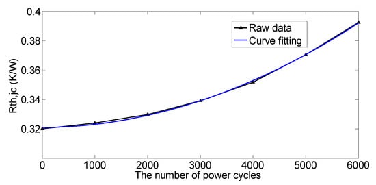 Equation (1) showed when tends to infinity, the value of the junction-to-case thermal resistance is equals to the value of the transient state thermal impedance. Therefore, the junction-to-case thermal resistance reflects the aging state of the IGBT module in symmetry. According to the data of junction-to-case thermal resistance under different power cycles, the raw data curve is the black curve in Figure 3. In order to find the specific relationship between the IGBT junction-to-case thermal resistance and the number of power cycles. The black curve is fitted by the polynomial fitting method and the fitting curve is shown in Figure 3.