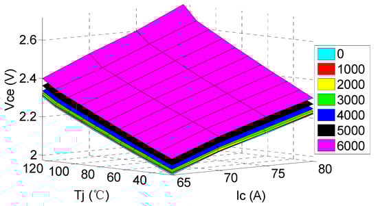Figure 5 presented that the numbers 0, 1000, 2000, 3000, 4000, 5000 and 6000 are the times of power cycles. With the aging of the IGBT, a three-dimensional surface composed of Ic, Tj and Vce is moved up overall, which indicates that Tj of the IGBT is closely related to the power cycles. The influence of the number of power cycles on the Tj should be fully considered in the process of establishing the IGBT junction temperature prediction mode.