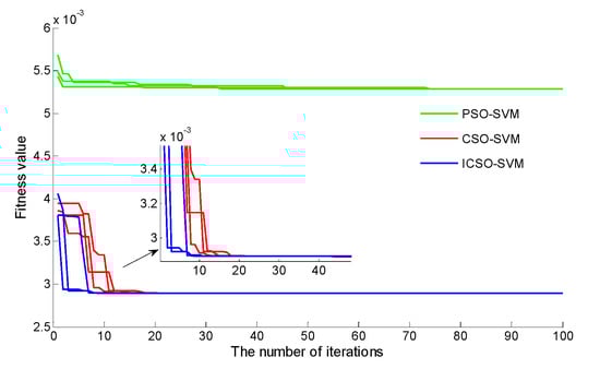 Figure 7 presented the iterative curve of the PSO-SVM model tends to be stable when the number of iterations is 76, and the fitness value is 5.29 × 10−3. The iterative curve of the CSO-SVM model tends to be stable when the number of iterations is 18, and the fitness value is 2.89 × 10−3. The iterative curve of the ICSO-SVM model is basically stable when the number of iterations is 7, and the fitness is 2.89 × 10−3. The iterative stability times and fitness value of the ICSO-SVM model are better than other models.