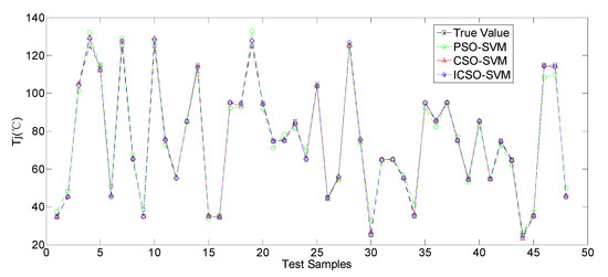 The prediction curves of Tj and predictive errors of the PSO-SVM, CSO-SVM and ICSO-SVM models are presented in Figure 8, Figure 9 and Figure 10.