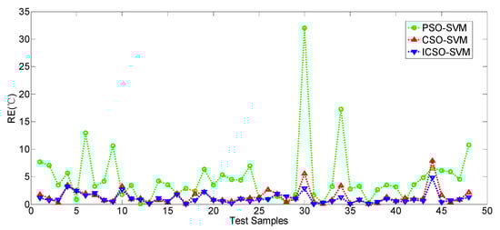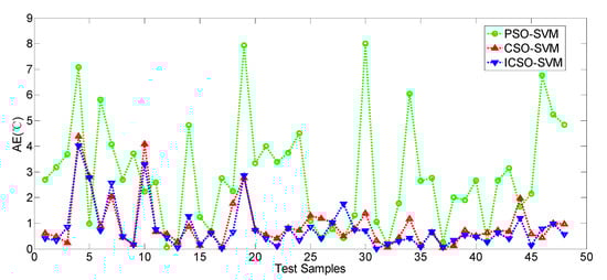 In order to verify the validity and practicability of the ICSO-SVM model, the ICSO-SVM model is used to predict the value of Tj. The absolute error (AE), relative error (RE), mean relative error (MRE), root mean square error (RMSE) and mean absolute error (MAE) are used to evaluate the test results of the ICSO-SVM model.
