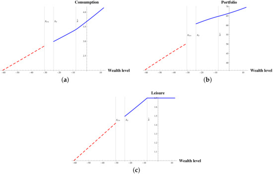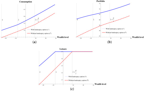 Debtor’s optimal strategies with and without option to file for bankruptcy () (a) Consumption. (b) Porfolio. (c) Leisure.