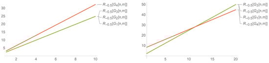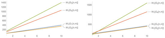 The above graphs for the nanotubes show a correlation of , , and with n and m. It can be seen that the indices have a linear correlation with n and m. This contrasts the correlation of the indices of and with n as the graphs are exponential and quickly rise. We only give an analysis for these three indices as the other indices ( and ) are similar and can be obtained from the Randic index with specific values of ( and , respectively), and therefore, the correlation between the indices and n (and m) does not change.