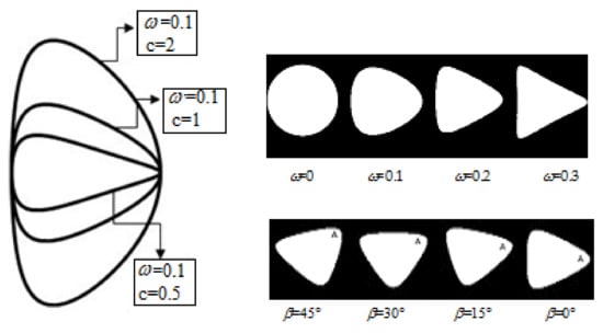 Concerning the above equations,  denote the roots of the properties equation of generally orthotropic plate and will later be discussed;  ascertains the hole size and is assumed as ;  is the aspect ratio of the hole (determines hole elongation or compression along y-axis); n shows the hole geometry (in this study, ). As presented in Figure 1, the parameter ω () represents the curve of hole corner; a larger ω creates a sharper edge while a less ω creates a sleeker corner. At the least value of ω (i.e., ), hole turns into a circle. The impact of this parameter on the evolution of hole geometry from triangular toward circle is illustrated in Figure 1. The parameter  in the equations above denotes the hole orientation angle.