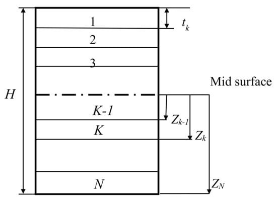 where,  and  represent  the space between upper and lower limits of the kth layer to to the middle surface (Figure 2). Every layer has a fixed thickness . For a laminate that possesses  layers, the overall thickness  is:
