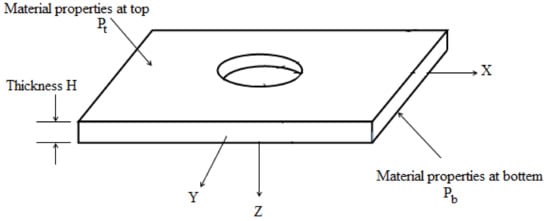 Such that  is the gap from the X-Y plane at the plate center within the mid surface, M. P(z) is the substance characteristic at distance z, , H is the total thickness,  is the material property in the top layer of the FGP and  the material property in the bottom layer of the FGP, as in Figure 3. In the present composite material, top and bottom laminates have a 90-degree and 0-degree fiber angle, correspondingly.