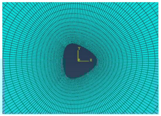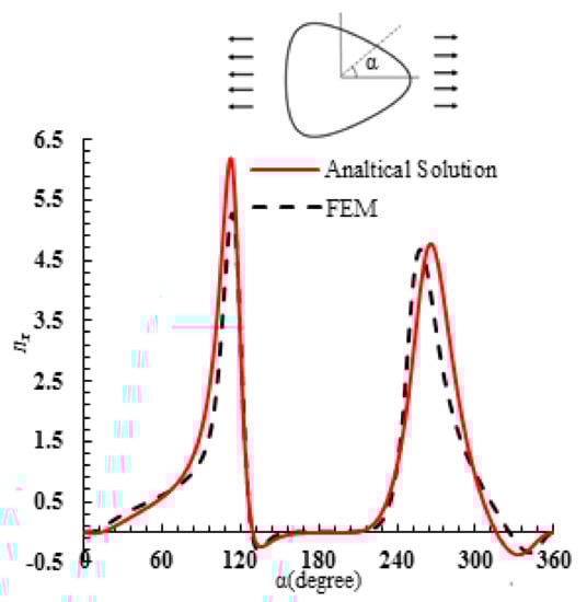 The implemented load was . For the purpose of obtaining optimal mesh grid and enhancing the preciseness of FEM outcomes, the region at the hole’s proximity was modeled using a smaller mesh compared to farther regions. Meshing took place using S8R elements in regard to the physics and geometry of the issue at hand. Figure 4 provides a comparison of the stress resultant Ny acquired from the provided analytical solution including one provided by the numerical solution. Figure 5 presents a resembling comparison of the stress resultant Nxy. The angle α denotes the points’ position on the hole boundary in regard to the horizontal axis. The mesh and loading patterns are depicted in Figure 6 and Figure 7, correspondingly. The maximum resultant forces’ ratio at the hole corner to the implemented load is considered as the normalized stress resultant. Evidently, when the implemented load is 1, i.e., (), hence the normalized stress resultant is the resultant forces. Furthermore, the normalized moment resultants ( and ) are defined as (,,) correspondingly [], such that H is the overall laminate thickness.