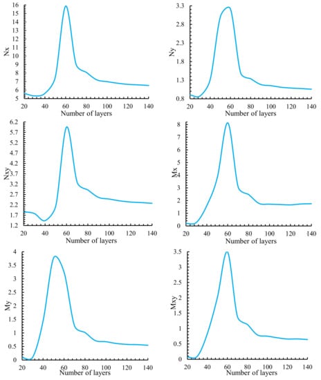 In this section, we investigate the forces and moments per unit length of FGPs with quasi-triangular hole. In Figure 8, the maximum resultant forces acquired around a triangular hole in asymmetric laminate from modeling with 20 to 140 layers are presented. Evidently, as the number of laminate (N) is increased, the stress resultant primarily increases, and subsequently decreases until gradually reaching a constant value at N = 90. Consequently, every research outcome was calculated with N = 100 layer number, which is accordance to dimensionless ply thickness of 0.01.