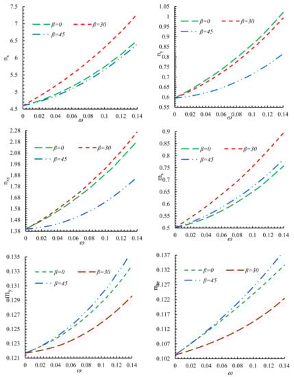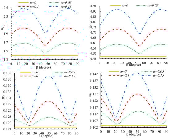 Figure 9 presents the discrepancies of the normalized forces and moments per unit length with the rotation angle of triangular hole (β) in various values of bluntness parameter (ω). Because the difference of resultant forces with hole orientation are periodical, the outcomes are provided for β values of up to 90 degrees. Based on this figure, for all values of ω, by decreasing the value of ω, the forces and moments per unit length is reduced. In each value of ω, the minimum normalized resultant forces (nx, ny, nxy) occur at approximately rotation angle of 45° and the rotation angle of 20° leads to the maximum normalized resultant forces. For example, the normalized resultant forces (nxy) presented in Figure 9.