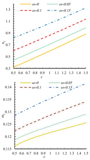 The aforementioned parameter c guides the hole’s aspect ratio and solely influences the outcomes along the y-direction. The impact of this factor on the maximum resultant forces acquired with various curvature factors at zero-degree orientation (β = 0) are shown by Figure 10. Evidently, as c is increased, all resultants enhanced linearly. This is evident in all values of bluntness parameter. As shown in this figure, the lowest values of forces and moments per unit length happen in ω = 0 which is equivalent to a circular hole. Regarding the similarity of linear behavior in both cases, two samples of the vector (ny, my) are selected excellently.
