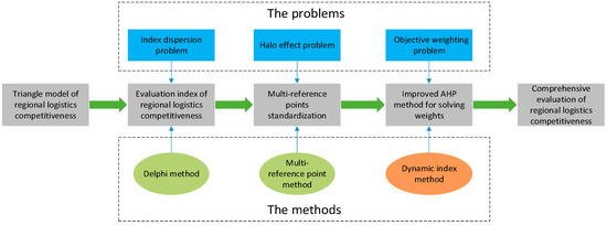 In view of the above reasons, aiming at problems such as the evaluation index system of regional logistics competitiveness being complex and scattered, the normalized distribution of evaluation data being extremely asymmetric and seriously deviating from the normal distribution, and the logic of calculating the index weights by AHP not being accurate, this paper constructs a triangle model of regional logistics competitiveness based on Porter’s diamond model, and it selects closely the related absolute types of indexes from the perspective of the supply chain to build a regional logistics competitiveness evaluation index system. Based on the concept of symmetry theory, a normalization method of segmented mapping with quartiles of various indexes as multi-reference points is proposed by selecting appropriate reference points to standardize the data, thus making the standardized data distribution more reasonable. The dynamic index scale is used to determine the scale of the analytic hierarchy process, and the evaluation matrix is constructed based on the importance level grading table, while the index weights are directly solved without a consistency check, which improves the logical accuracy of the weight calculation of AHP. Then, the index weights are calculated based on an improved analytic hierarchy process. Finally, the comprehensive evaluation value of the logistics competitiveness of each province is weighted, and the evaluation values are sorted and compared. The magnitude of logistics competitiveness can be used as a reference for regional logistics decision-making; this will help provinces and cities recognize the current status of competitiveness in the logistics industry, and this can provide decisions for adjusting the industrial structure, accelerating the construction of logistics infrastructure, and promoting the healthy development of the logistics industry. The method of this paper can be used for multi-criteria decision-making and for a comprehensive evaluation in other fields; the multiple reference points can improve the halo effect (i.e., the index takes a part for the whole) when the index data range is too large, and the dynamic index can improve the analytical quality of the AHP. The research method and framework of this paper are shown in Figure 1.