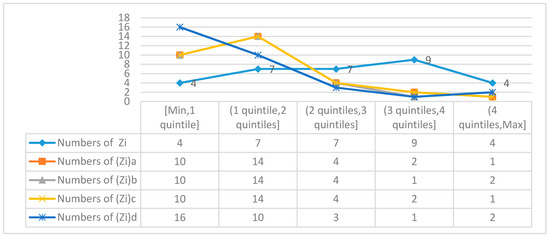 If the index is a positive (benefit type) index, the greater the expectation is, the better, and then the index has the maximum polarity and takes the maximum value. If the index is a reverse (cost-type) index, the smaller the expectation is, the better, and then the index has the minimum polarity and takes the minimum value. If the index is a specified value or a medium-sized index, the index has a moderate value polarity, and the specified value or average value is taken. Considering the extreme value of the attribute index, the original data was normalized by using an improved normalization method. Taking the quartile as the dividing point, the original evaluation value was divided into four intervals. According to the ratio and according to the relationship between the ratios of the maximum value of the index (assuming the index is a positive index) and the three-quarters quantiles, the maximum and median, the median and quarter quantiles, and the reference ratio, the data that need to be mapped in sections were transformed to get more scientific and reasonable normalized data.