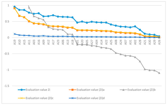 According to the row vector of the weighted evaluation matrix, the comprehensive evaluation value of each evaluated object was calculated, and the comprehensive evaluation value Zi of the evaluated object Ai was calculated as follows: