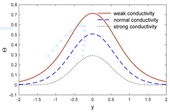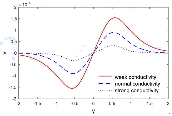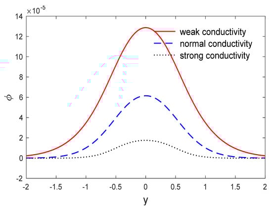 The variation in horizontal displacement  along  when y , for weak, normal and strong conductivities.