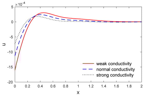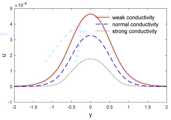 The variation in horizontal displacement u along y when x = 0.5, for weak, normal and strong conductivities.