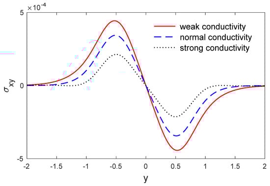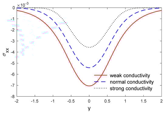 The variation in stress  along  when y , for weak, normal and strong conductivities.