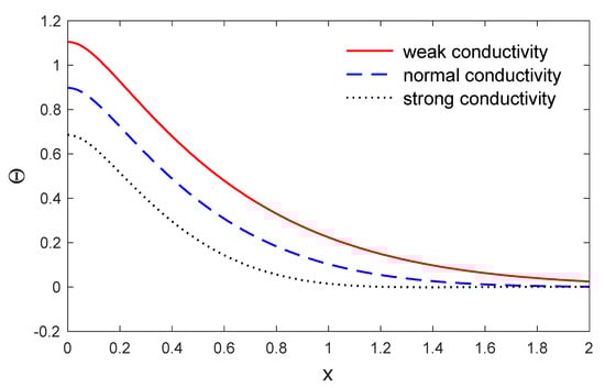 The variations in temperature  along  when x , for weak, normal and strong conductivities.