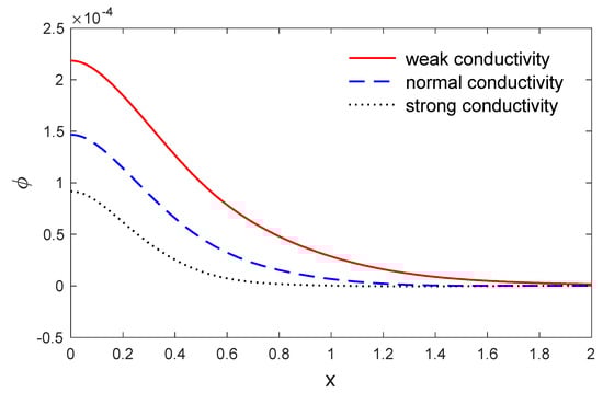The changes in the volume fraction field of the voids distribution φ along y when x = 0.5, for weak, normal and strong conductivities.