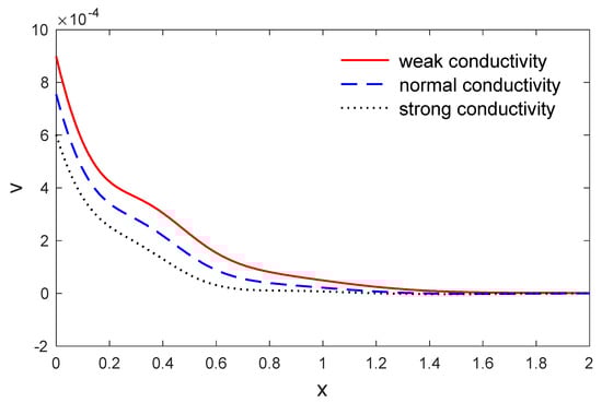 The variation in vertical displacement  along  when x , for weak, normal and strong conductivities.