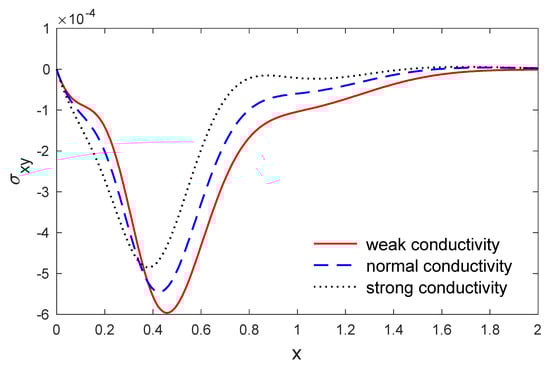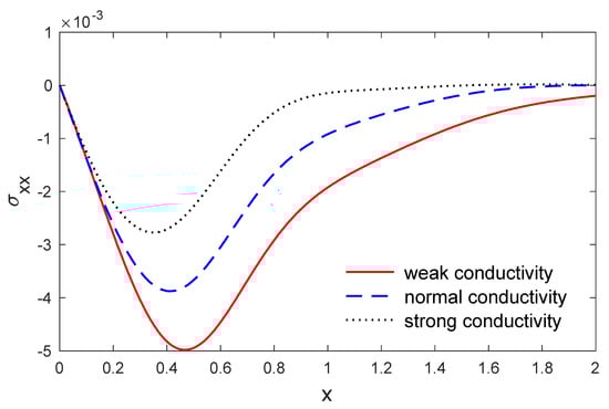 The variation in stress  along  when x , for weak, normal and strong conductivities.