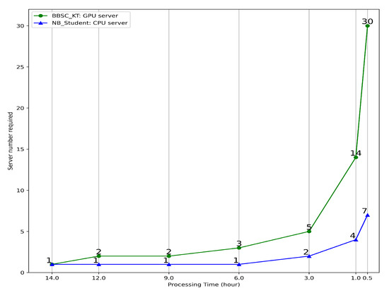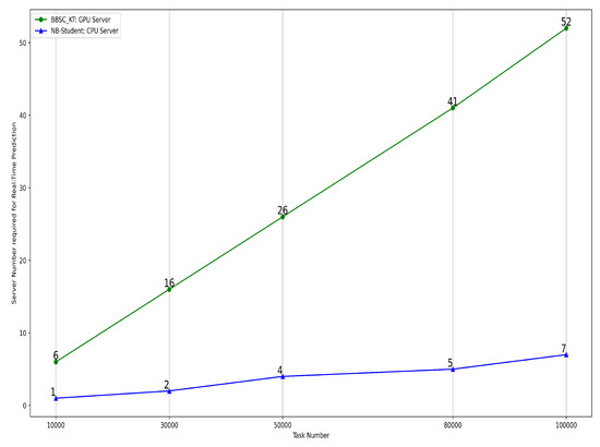 According to Table 4 and Figure 12, both BBSC-KT and NB-Student could conduct 1000 tasks within 14 h. However, if less time required, the cost for computation would significantly increase. As BBSC-KT needs GPU server which is much expensive, so it is not suitable for real-time processing. So, the authors suggest that BBSC-KT only is required to be trained offline regularly (e.g., 10 GPU servers could handle 10,000 tasks within two week). NB-Studnet is more suitable for real-time processing.