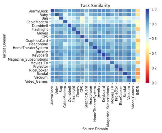 In the experiment, there had been 21 task domains. 20 of them are Amazon product reviews and the last one is the IMDB movie reviews. All of them had been introduced in Section 5.1. Expect using unsupervised method to calculate similarity, we also could use previous classifier to validate the new task. Here we collected the BSCC classifiers for the Amazon tasks and used them to predict the rest tasks. According to the Figure 15, Amazon tasks’ classifiers could achieve a good performance upon the rest Amazon tasks while all they perform worst upon the IMDB task. This leads an obvious conclusion: the IMDB task is much different with previous Amazon tasks and there are any classifier could handle it, so it is a novel task. So, the ‘supervisor’ starts to train a new BSCC model and another student model.