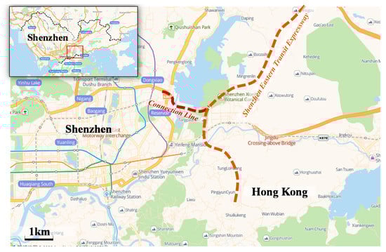 The Shenzhen Eastern Transit Expressway Connection Line Tunnel is a crucial project in Guangdong Province, China [,]. Its west end is connected to the Aiguo Road interchange, and the east end is connected to the main line tunnel (Figure 1). The project is designed to be a two-way six-lane road tunnel with a total length of 3113 m, in which the southern line is 1681 m long, and the northern line is 1432 m long. The buried depth is 10–30 m, whereas the excavation section is 16.18 × 11.66 m (width × height). Furthermore, as shown in Figure 2, the section of the tunnel is symmetrical. The Connection Line passes through carboniferous stratified metamorphic quartz sandstone with developed joint fissures and abundant underground water, whereas the surrounding rock is mainly classified as Grade IV. The tunnel is only 250 m distance from the Shenzhen Reservoir and passes beneath many masonry structure buildings and water supply lines. How to reduce the settlement caused by tunnel excavation is the critical factor of the project. In this paper, an area in Grade IV3 surrounding rock with a buried depth of 20 m was selected as the main research object.