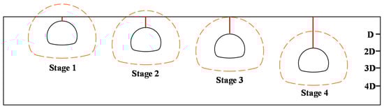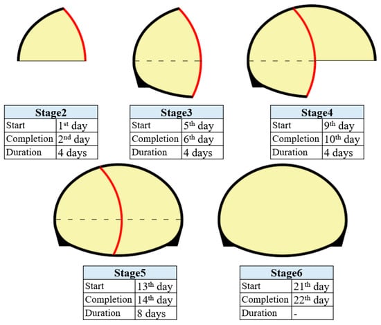 Considering the surrounding rock condition and buried depth, the Grade IV surrounding rock section of the tunnel is designed to be excavated by the CD method, and the construction cycle footage is 1 m. The construction process of the CD method consists of six key stages (Figure 3): the stage before excavation (Stage 1), the excavation and support of the upper-left section (Stage 2), the excavation and support of the lower-left section (Stage 3), the excavation and support of the upper-right section (Stage 4), the excavation and support of the lower-right section (Stage 5), and the demolition of the center diaphragm (Stage 6). Taking the four-steps CD method as an example, Figure 4 shows the longitudinal section of the CD method, and Figure 5a shows the section of the CD method. In order to reduce the settlement caused by construction, the VCD method was proposed, as shown in Figure 5b.
