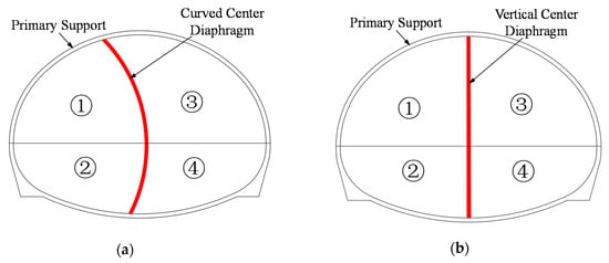 In the CD method, the tunnel is divided into two right and left sections by a curved center diaphragm []. In deep tunnels, the curved central diaphragm can form a ring structure with the primary support of the first excavation part, which can not only transfer the vertical earth pressure from the arch crown, but also resist the lateral earth pressure from the side walls []. However, due to the small lateral earth pressure of shallow tunnels, the curved center diaphragm would have an unstable stress state and cannot provide sufficient support to the arch crown [,]. Presently, there is no research giving effectual measures to cover the disadvantages mentioned.
