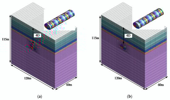 where  is the boundary depth between shallow and deep tunnels (m);  is a constant, (two for Grade I–III surrounding rock, 2.5 for Grade IV–V surrounding rock);  is the load equivalent height (m);  is the surrounding rock grade;  is the width influence coefficient;  is the maximum excavation span of the tunnel (m); and  denotes the rate of increase or decrease of the surrounding rock pressure for every 1 m increase or decrease in ,  = 0.2 when  < 5 m, = 0.1 when  > 5 m. When the surrounding rock is Grade IV3 and the tunnel span is 16.18 m, the boundary depth is 38 m. Therefore, a buried depth of 5–40 m was used in the calculations, corresponding to 0.5D–4D. D is the equivalent diameter of the tunnel. Thirteen cases were investigated in this part, and the details are presented in Table 3.
